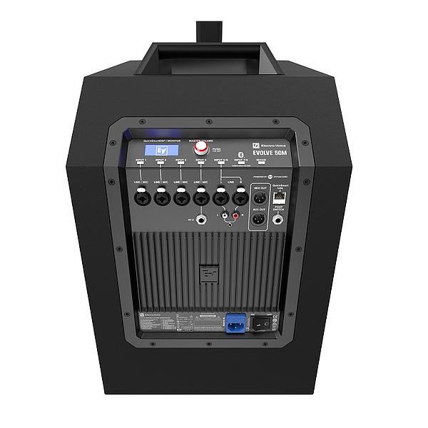 The EVOLVE 50M’s control panel features ElectroVoice’s powerful QuickSmart DSP, which allows the navigation and adjustment of all audio, effects and mix functions via an LCD with single-knob control or via the QuickSmart Mobile app, as well as multiple options for signal routing and inputs. Functions include four presets (Music, Live, Speech, Club), three-band system EQ (low, mid, high), seven-band graphic EQ (in Mixer mode), five user programmable presets (Store and Recall settings), phantom power, visual monitoring of limiter status, input level control and meters, and a master volume control to optimize gain structure.