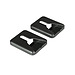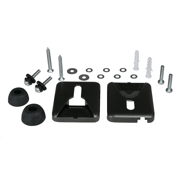 The simple, nevertheless, very efficient principle provides an easy and quick installation. It is based on two wall brackets with V-shaped notch which have to be installed against the wall. Two cylindrical plastic bushings have to be fixed to the provided points on the bass cabinet using the included screws. Subsequently, the cylindrical plastic bushings have to be hooked into the V-shaped notch of the wall brackets.