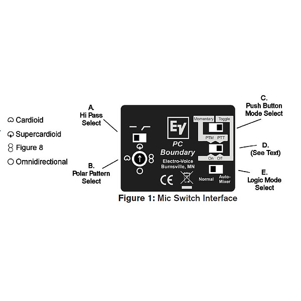 The PC Boundary mic is a low profile microphone that can be used with standard and automatic mic mixers. The PC Boundary mic is a member of the EV PolarChoice series of multi-pattern microphones, and is highly-shielded from RFI/GSM thanks to EV’s exclusive RF Shield technology. The multi-pattern versatility of the PolarChoice microphone makes it a true “problem solver”. With one non-directional and three directional polar patterns available, PolarChoice microphones are ideal for virtually any installation. Of particular interest is the figure 8 pattern that allows miking people on opposite sides of a table with only one microphone, while providing a dramatic reduction of ambient room noise.