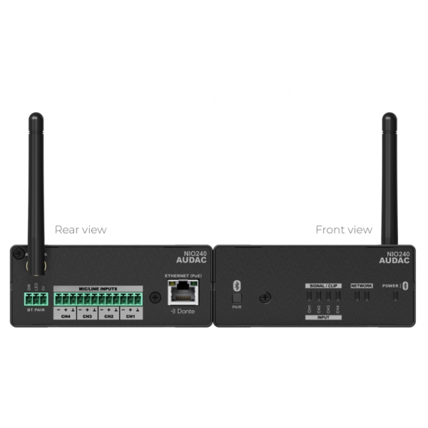 The AUDAC NIO240 is a compact, PoE-powered network I/O mixing breakout box designed to seamlessly integrate analog and digital audio sources into Dante™/AES67 networks. Featuring four mic/line inputs with switchable +48V phantom power via 3-pin Euro terminal blocks, it facilitates flexible audio distribution in various environments. The device includes an integrated Bluetooth 4.2 receiver for wireless audio streaming and offers integrated DSP functions such as EQ, automatic gain control, noise gating, and WaveTune™, all configurable through the AUDAC Touch™ platform. Its S-box™ modular multifunctional enclosure allows for versatile mounting options, including under-desk, wall, ceiling, or rack installations, making it ideal for retail, education, corporate, hospitality, and sports facilities applications.