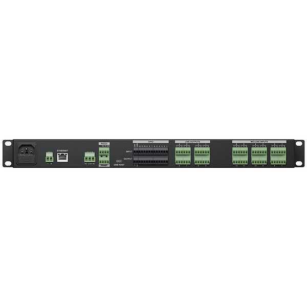 It includes 12 Mic/Line Inputs and 8 Line level outputs. Additionally, up to 32 Dante™/AES67 I/O Channels are available with a single ethernet port, allowing the integration of the system with any Dante™/AES67 compatible audio over IP I/O unit.