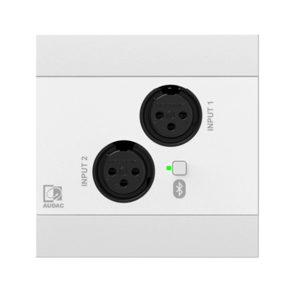 The AUDAC NWP220PLUS/W is a sleek, PoE-powered Dante™/AES67 networked audio input panel featuring two XLR inputs and an integrated Bluetooth 4.2 receiver. Designed for seamless integration into modern AV systems, it allows for flexible audio input options, supporting both line-level and microphone-level signals with switchable +48V phantom power. The panel includes internal DSP processing with EQ, automatic gain control, and other configurable settings via the AUDAC Touch™ software. Its elegant design features a fingerprint-resistant glass front panel, and it's compatible with standard EU-style in-wall boxes. The package includes the WB45S/FG flush-mount wallbox, making it ideal for installations in corporate, educational, hospitality, and government environments.