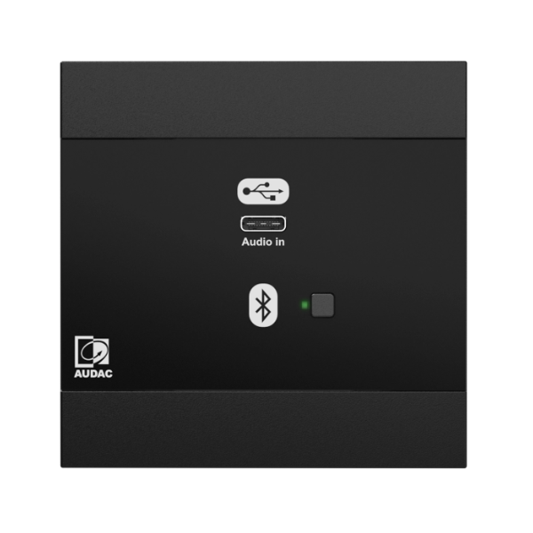 The AUDAC NWP400PLUS/B is a sleek, PoE-powered Dante™/AES67 networked audio input panel featuring a USB Type-C port and an integrated Bluetooth 4.2 receiver. Designed for seamless integration into modern AV systems, it allows for flexible audio input options, supporting stereo audio signals from various devices such as laptops and smartphones. The panel includes internal DSP processing with EQ, automatic gain control, noise gating, and WaveTune™, all configurable through the AUDAC Touch™ software. Its elegant design features a fingerprint-resistant glass front panel, and it's compatible with standard EU-style in-wall boxes. The package includes the WB45S/FG flush-mount wallbox, making it ideal for installations in corporate, educational, hospitality, and government environments.