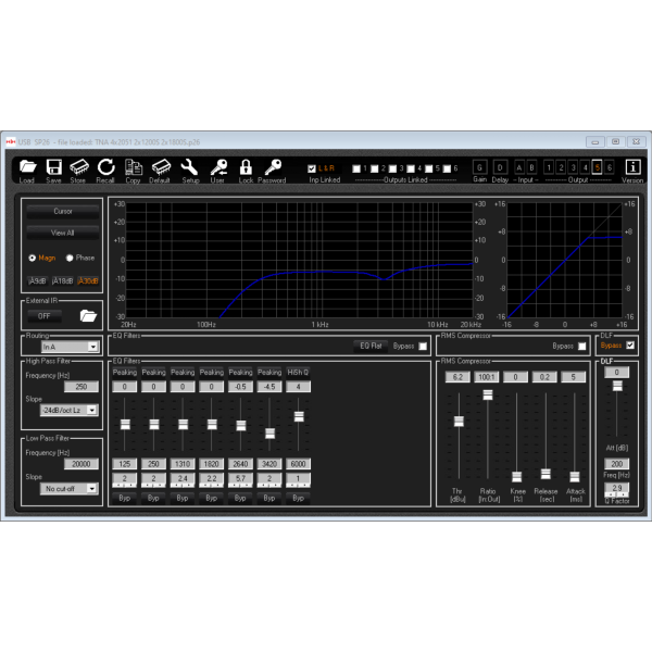 Featuring 2 analog inputs and 6 analog outputs, each managed by a powerful DSP Engine. Each input channel provides PEQ, gain control, Dynamic Low boost, noise gate function, RMS compressor, internal White/Pink Noise Generator, and configurable delay. Each output offers up to 7 PEQ and crossover filters.