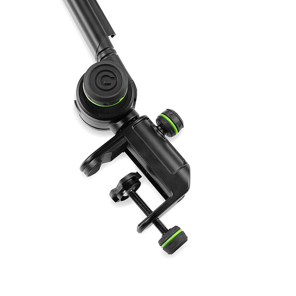 With its three joints the desk-mounted microphone boom arm can be placed in pretty much any position you want. Another special feature that Gravity® developed for the microphone holder mechanism allows you to pull out the entire microphone holder with one hand and rotate it in 90° increments, even after the microphone has been screwed in place with the microphone or shock mount. The holder then automatically snaps back into place.