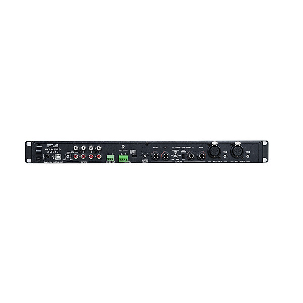 The first is a front panel jack socket that uses our exclusive iJax 6.35 to 3.5mm cable for access to a phone’s output. Then there are 3 standard RCA type inputs on the back plus our exclusive BGM input. Use the BGM input for either Virtual Classes audio or the club’s background music when classes are done. The neat thing about this input is the volume is governed by a rear mounted screw pot. The front volume control does not operate this input. Unsupervised members cannot turn up the volume of the BGM input any louder than the original setting.