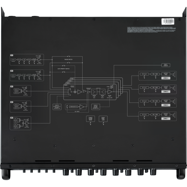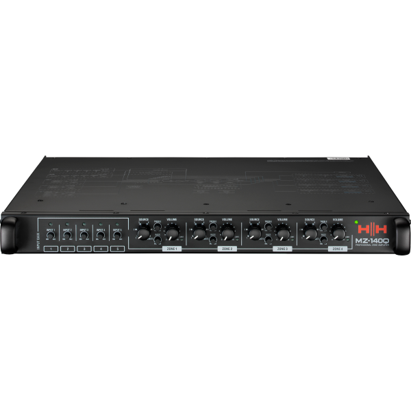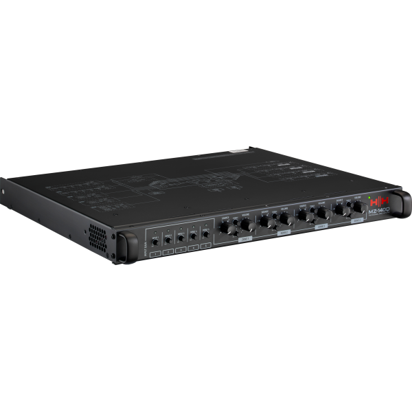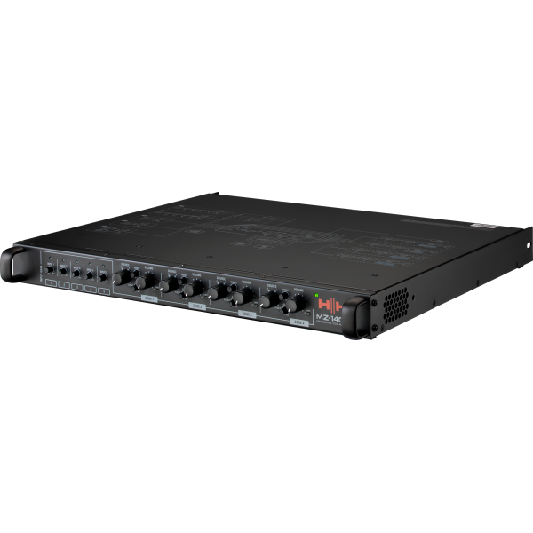 The MZ-140Q features four individual 140 Watt RMS Class D power amplifiers and each amplifier can be configured to run 70/100 Volt or at minimum 4Ohm impedance. Each amplifier is a zone, and there are front panel controls for volume, two band eq and source select per zone. There are five flexible input channels, each with a front panel mounted gain trim control. Dual combi microphone inputs allow two individual mics to be connected simultaneously both with auto or manual priority modes. Built in a full size 1U rack case, the unit is extremely robust with easily operable controls. Front 'scribble' strips allow the installer to easily identify each zone and input identification. The perfect installation amplifier for retail, leisure, café, bars and halls.