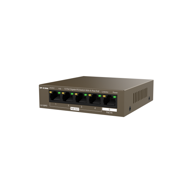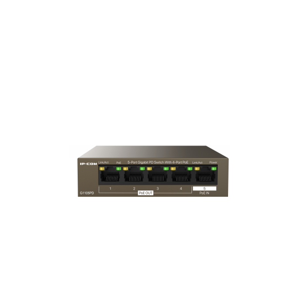 The ICMG1105PD is a versatile 5-port Gigabit switch designed for surveillance and networking applications in mid-sized deployments. It features 4 PoE OUT ports compliant with IEEE 802.3af and 1 PoE IN port compliant with IEEE 802.3af/at, allowing it to function both as a Power Sourcing Equipment (PSE) and a Powered Device (PD). With a total PoE power output of 22W and a single-port output of up to 15.4W, the switch is ideal for powering low-power devices like IP cameras and APs.