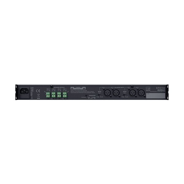 The EPA104 is built as a quad channel amplifier containing four individually controllable channels capable of delivering a power of 4 x 100 Watt in stereo mode. The outputs can be bridged two by two for merging their power, while an integrated (selectable) active crossover network allows to apply high pass and low pass filters to the channels, creating a sub / top configuration for a stereo system with bass cabinet. Specific functions and advanced protection circuitry which protects against DC malfunctioning, short circuit, overheating and overload.