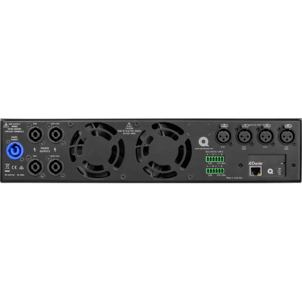 The QX41500D is a high-performance 2RU rackmount amplifier delivering 4 x 1500W of continuous power, designed for demanding multi-zone installations. Built with superior UMAC™ Class-D technology, it ensures ultra-low distortion, high dynamic range, and consistent audio fidelity. The unit is equipped with Dante™/AES67 digital audio networking via an expansion card, making it ideal for modern AV environments where scalable, networked audio is required. Smart energy features such as per-channel standby with 1ms wake-up and advanced protection systems ensure long-term reliability and reduced operational costs.