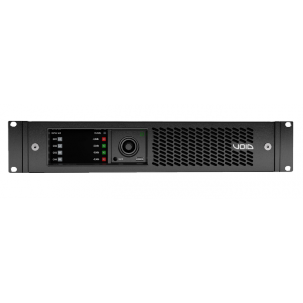 The Void Acoustics Bias Q3 is a high-performance 4-channel power amplifier delivering up to 2000W per channel at 2Ω and 4Ω, and 1400W at 8Ω. Designed for versatility, it supports both low-impedance and 70V/100V distributed line systems, making it ideal for a wide range of applications including festivals, live music venues, nightclubs, and touring setups. The amplifier features advanced DSP capabilities, including multi-stage signal processing, FIR/IIR equalization, and comprehensive limiting. It offers flexible input options with analog, AES3 digital, and Dante/AES67 networking, and is controlled via a 4.3” touch screen display or remotely through the ArmoníaPlus software suite.