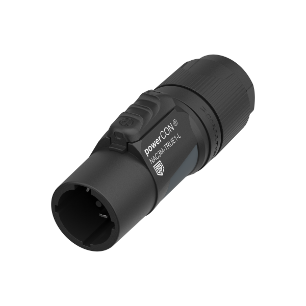 The NAC3M-TRUE1-L is a heavy-duty locking male cable connector from Neutrik’s powerCON TRUE1 series, designed for secure and reliable AC power connections in harsh and demanding environments. This true mains connector features breaking capacity (CBC), meaning it can be safely connected or disconnected under load. It is certified according to EN IEC 60320-1, UL 60320-1, and CSA C22.2, supporting 16 A at 250 V AC (Europe) and 20 A at 250 V AC (US/Canada), making it ideal for global power applications in professional AV and industrial systems.
