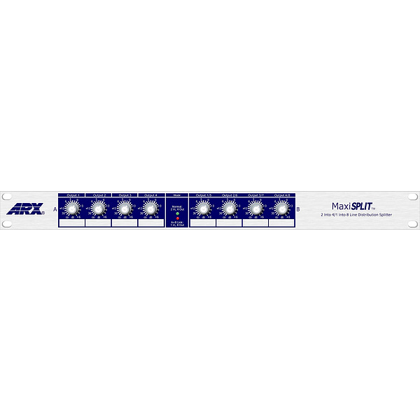 To fulfil this seemingly simple but important signal splitting task, ARX have designed the MaxiSPLIT: - two independent channels of 1 into 4 Splitters, switchable to a single channel 1 into 8 Splitter by using the rear panel channel link switch. Mode status is shown by the front panel LED indicators.