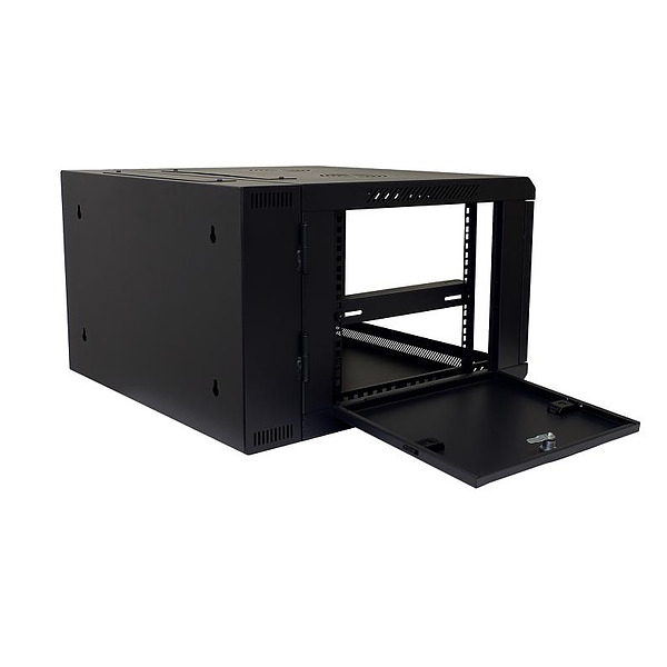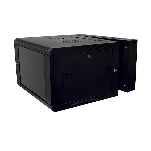 The Global WMS-6606BK ia s 6U double section rack enclosure designed to be wall mounted.