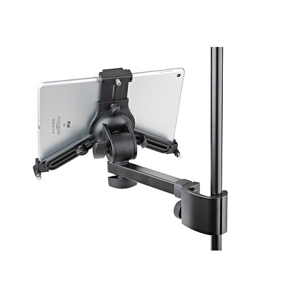 Universal Tablet Holder for different models. The Universal Tablet Holder can be adjusted variably to accommodate different tablet sizes without needing tools and holds the devices securely and effectively for many different situations. Be it on stage, in rehearsal rooms or at home - thanks to the strong clamp element with the ergonomic clamp screw the holder can be attached to any tube up to 30 mm quickly and easily.