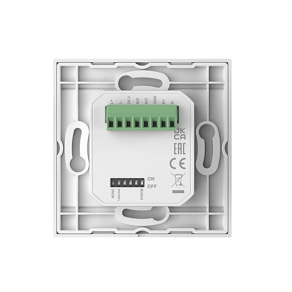 On the front side of the wall panel, there is a 3.5 mm jack stereo line input connection available together with a balanced XLR microphone input, both provided with their own knob which allows the signals to be mixed together.
