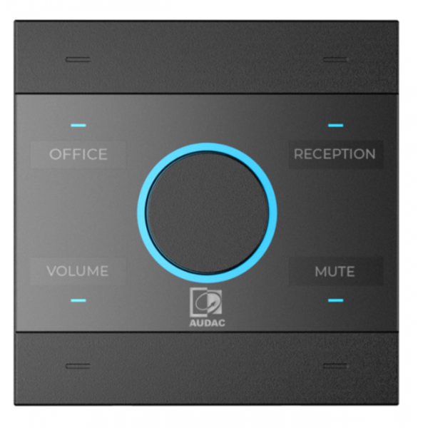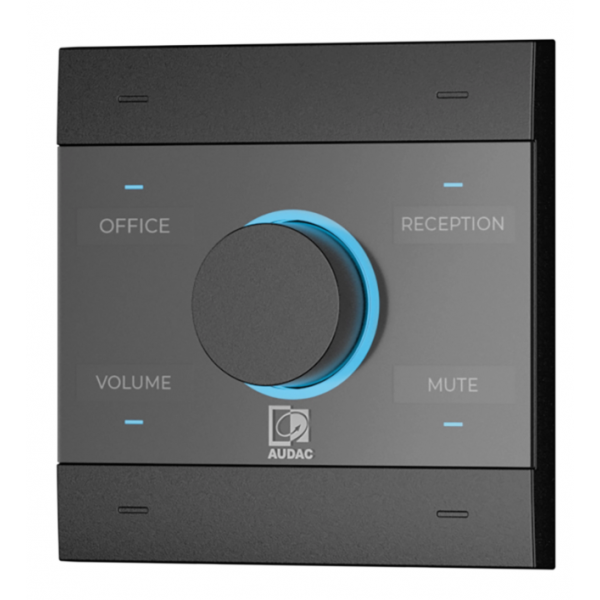 The AUDAC NCP105PLUS/B is a sleek, programmable wall-mounted controller designed for seamless integration into AV systems. It features four capacitive touch buttons and a rotary encoder, each with RGB LED indicators, allowing for intuitive control over functions like volume, source selection, and routing. The panel communicates over IP and is powered via PoE (IEEE 802.3at), ensuring a single-cable installation. Its elegant design includes a fingerprint-resistant glass front and transparent name tag windows for easy customization. The NCP105PLUS/B is compatible with AUDAC Touch™ software, enabling flexible configuration without the need for coding. It fits standard EU-style in-wall boxes and comes with the WB45S/FG flush-mount wallbox for hollow wall installations, making it ideal for various environments such as corporate offices, educational institutions, and hospitality venues.