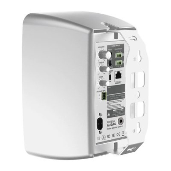The integrated amplifier can deliver a power of 2 x 40 Watt and includes a stereo line input which is implemented balanced and unbalanced, allowing convenient connection to any kind of audio source. Unbalanced audio sources are connected through a 3.5 mm jack connector, while balanced sources can be connected to the terminal block input connection allowing long signal runs without interference. A volume potentiometer allows the user to adjust the level of loudness while the two-band tone control allows equalization of treble and bass. The auto-standby mode reduces power consumption when no input signal is detected. The active speaker includes a stereo amplifier module, also delivering the input signal to the passive unit.